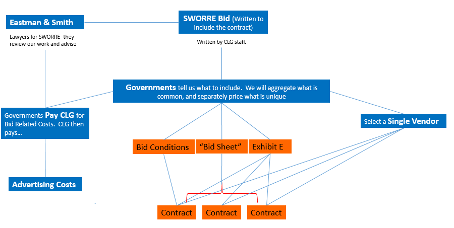 CLG staff work with a SWORRE bidding group to identify the services they want to collectively and individually provide. Collective services are bid together, individual services are placed in an “Exhibit E” document in each government’s contract and individually priced (based on pricing laid out in the SWORRE bid sheet). Governments split the cost of bid advertising and legal counsel.